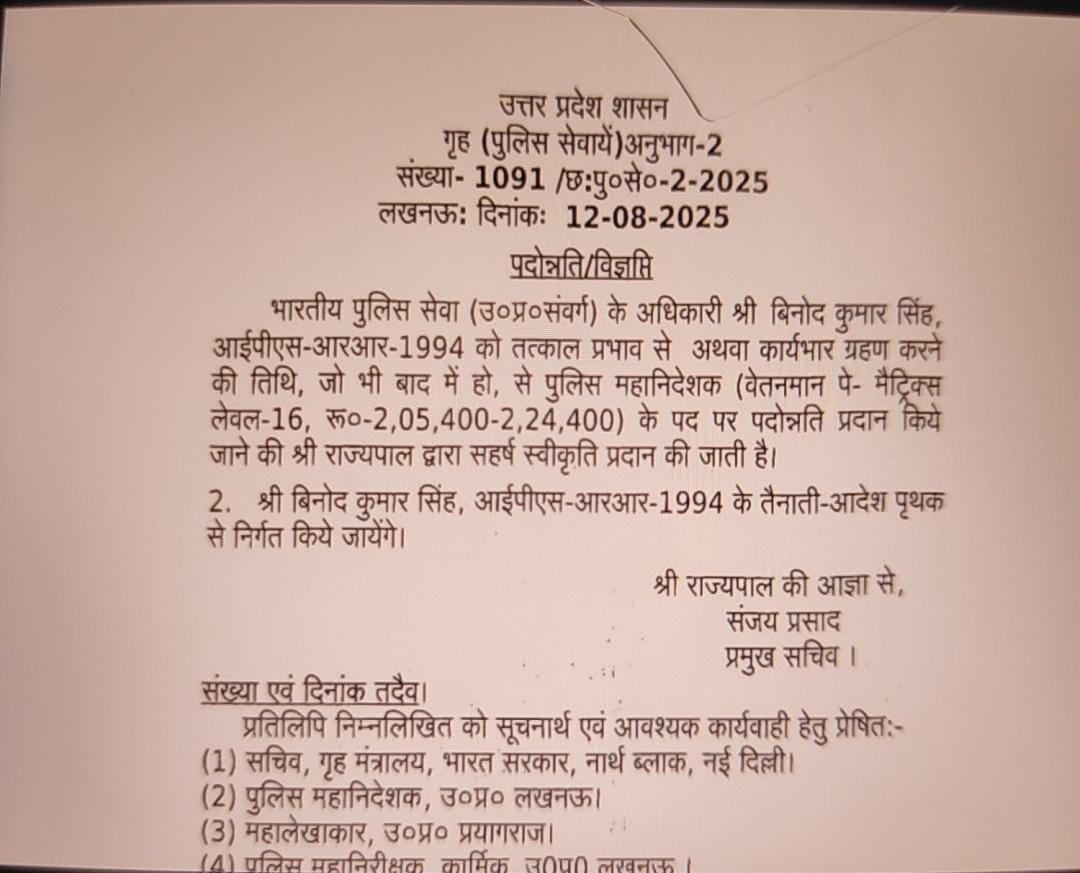 लखनऊ। उत्तर प्रदेश पुलिस सेवा में बड़ा फेरबदल किया गया है। 1994 बैच के वरिष्ठ आईपीएस अधिकारी बिनोद कुमार सिंह को पुलिस महानिदेशक (डीजी) पद पर प्रोन्नत किया गया है। फिलहाल वे अपर पुलिस महानिदेशक (एडीजी) साइबर क्राइम के पद पर तैनात हैं।