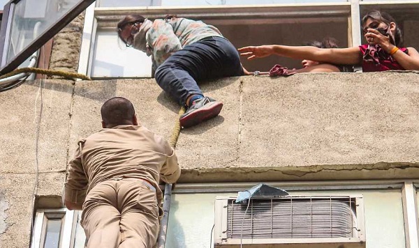 कुछ लोगों ने सीढ़ियों से निकलने का प्रयास किया, लेकिन धुएं के चलते नहीं निकल सके। इसके बाद लोग खिड़की से झांककर मदद के लिए चिल्लाने लगे। जान जाने के डर से कुछ लोग नीचे कूदने के लिए खिड़कियों से लटक गए तो कुछ लटककर निचली मंजिल के एसी आउटर या छज्जे पर आ गए। मौके पर जमा भीड़ ने उन्हें हिम्मत बंधाते हुए न कूदने की सलाह दी। इसी बीच दमकल विभाग की गाड़ियां आनी शुरू हो गईं। मुख्य अग्निशमन अधिकारी ने बताया कि बचाव दल ने सभी को सकुशल बाहर निकाल लिया।