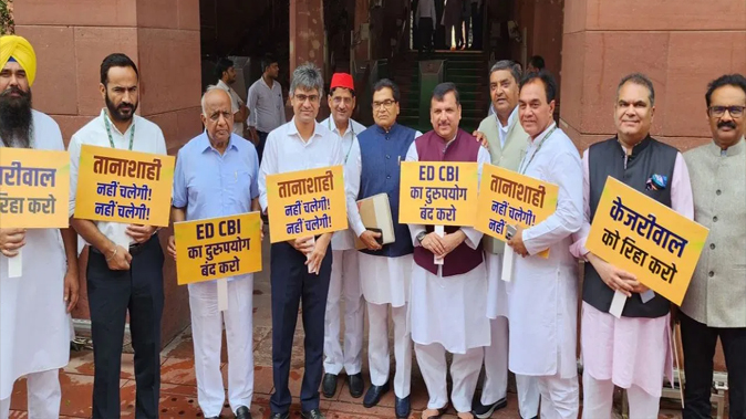 संसद के बाहर AAP सांसदों का प्रदर्शन, CM केजरीवाल की गिरफ्तारी पर जताया ऐतराज