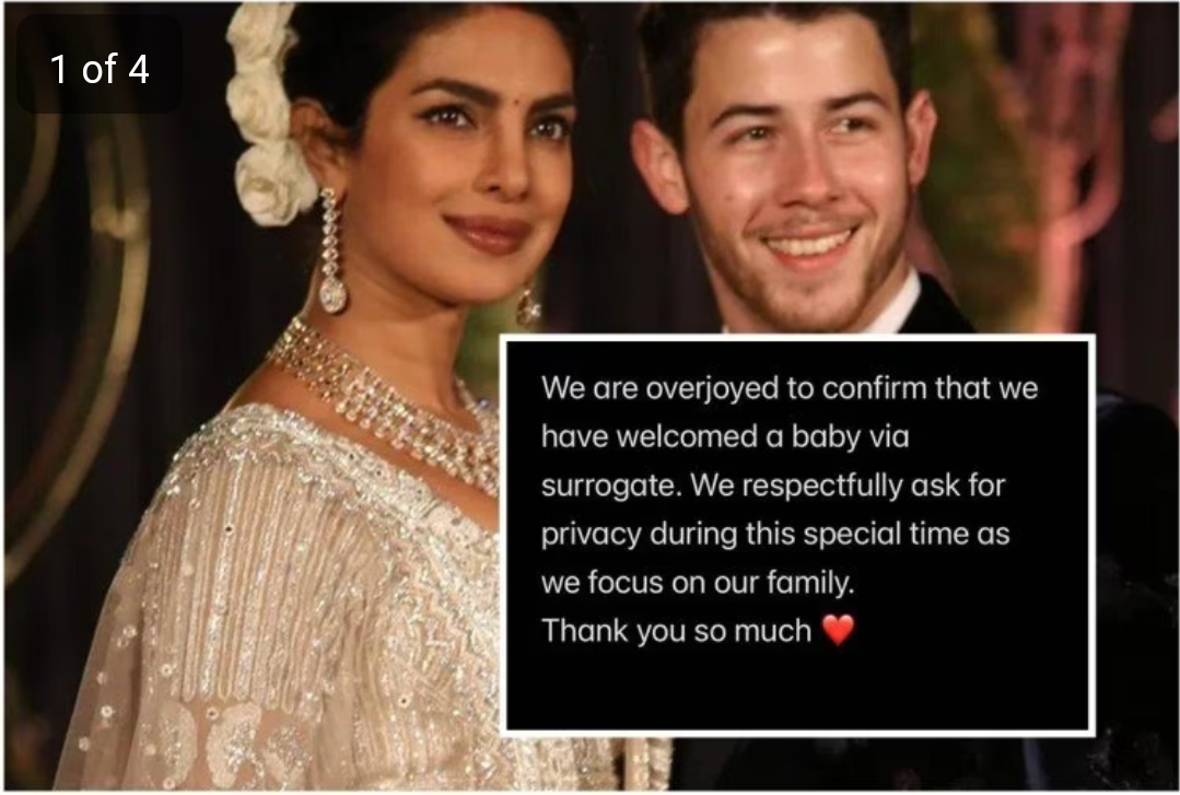 एक्ट्रेस प्रियंका चोपड़ा ने अपने इंस्टाग्राम अकाउंट पर एक पोस्ट शेयर कर के इस खुशखबरी को अपने फैंस के साथ शेयर की । कुछ देर पहले ही शेयर किए गए इस पोस्ट में एक्ट्रेस ने लिखा, ‘हमें यह बताते हुए बेहद खुशी है कि हमने सरोगेसी के जरिए अपने बच्चे का स्वागत किया है। अभिनेत्री ने आगे लिखा, ‘इस खास मौके पर हम सम्मान के साथ अपनी प्राइवेसी की मांग करते हैं, क्योंकि इस समय हम अपना ध्यान अपने परिवार पर केंद्रित करना चाहते हैं। सभी का धन्यवाद।’