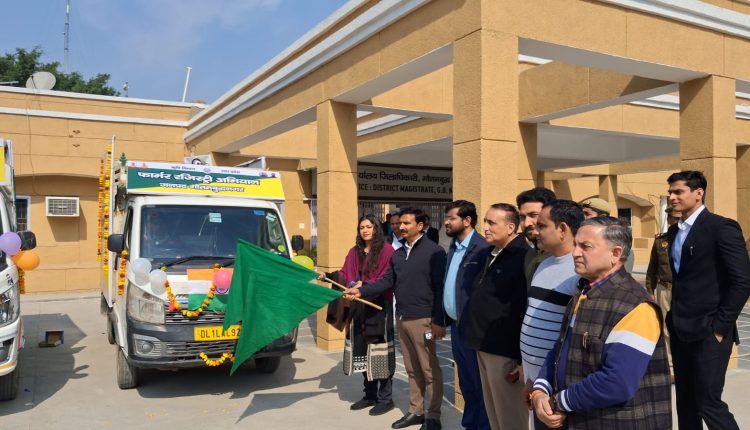 गौतमबुद्धनगर, 09 फरवरी 2026। जनपद के किसानों को फार्मर रजिस्ट्री के प्रति जागरूक करने और अधिक से अधिक पंजीकरण सुनिश्चित कराने के उद्देश्य से सोमवार को जिलाधिकारी ने कलेक्ट्रेट परिसर से प्रचार वाहनों को हरी झंडी दिखाकर रवाना किया। यह वाहन गांव-गांव जाकर किसानों को फार्मर रजिस्ट्री के महत्व, प्रक्रिया और इससे मिलने वाले लाभों की जानकारी देंगे।