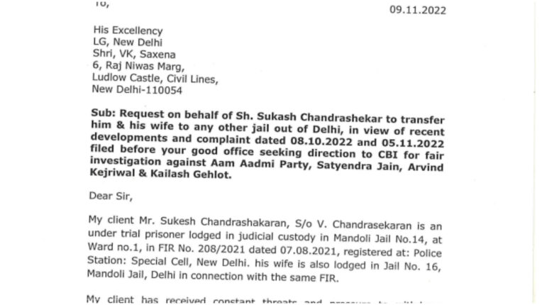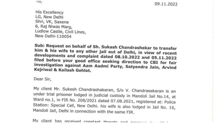 LG विनय कुमार सक्सेना के नाम लिखे गए पत्र में सुकेश ने लिखा कि जेल की सुरक्षा में अंदर तैनात जवान उसे मारते पीटते हैं। इसलिए LG को जल्द से जल्द उसकी ये मांग पूरी करना चाहिए। ताकि उसकी जान पर मंडरा रहा खतरा टल सके। उसने अपनी पत्नी को भी दूसरे जेल में भेजने के लिए मांग की है। गौरतलब है कि इससे पहले सुकेश चंद्रशेखर ने दिल्ली के उपराज्यपाल को तीसरी चिट्ठी लिखी थी जिसमें उसने एक बार फिर आम आदमी पार्टी नेता सत्येंद्र जैन पर गंभीर आरोप लगाते हुए कहा था कि अगर वो महाठग है तो सत्येन्द्र जैन ने मुझसे 50 करोड़ रुपये क्यों लिए थे।