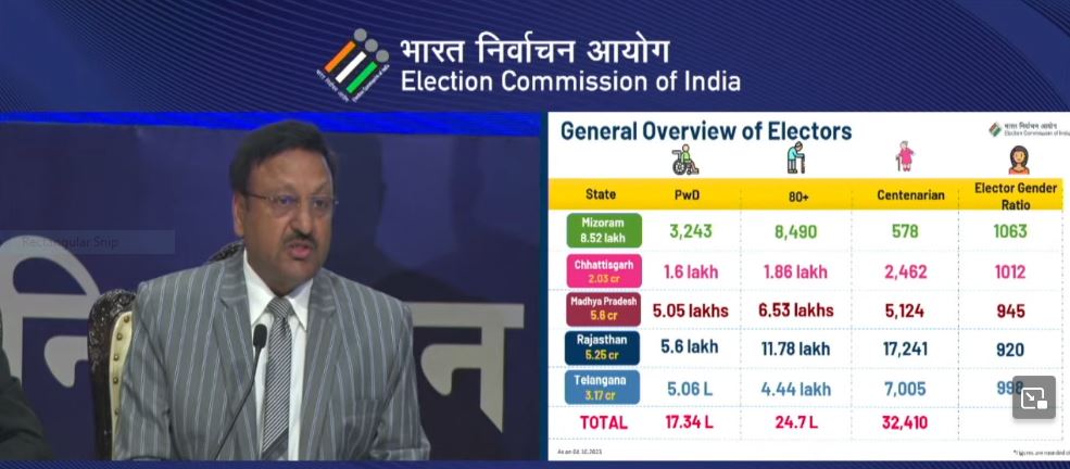 मुख्य चुनाव आयुक्त राजीव कुमार ने बताया, “मिजोरम, छत्तीसगढ़, राजस्थान, तेलंगाना और मध्य प्रदेश की विधानसभा सीटों को मिलाया जाए तो कुल सीटें 679 होंगीं… इस समय मिजोरम में 8.52 लाख, छत्तीसगढ़ में 2.03 करोड़, मध्य प्रदेश में 5.6 करोड़, राजस्थान में 5.2 करोड़ और तेलंगाना में 3.17 करोड़ मतदाता हैं। इन सभी को मिलाया जाए तो कुल 8.2 करोड़ पुरूष और 7.8 करोड़ महिला मतदाता हैं…”