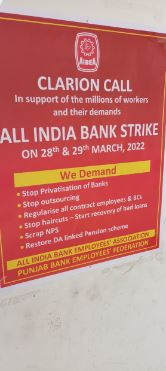 बैंक यूनियनों द्वारा आहूत हड़ताल से बैंकिंग सेवाएं प्रभावित होने की पूरी उम्मीद है। , जिससे आम लोगों को काफी दिक्कतों का सामना करना पड़ेगा । बैंक यूनियनों ने 28 मार्च और 29 मार्च (सोमवार और मंगलवार) को देशव्यापी हड़ताल का ऐलान किया है। इससे पहले, सप्ताह पर पर बैंक बंद रहेंगे, जिससे लगातार चार दिन बैंक बंद रहेंगे।