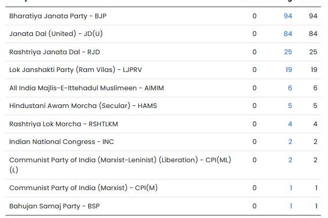 देश की मुख्य विपक्षी पार्टी एवं बिहार में विपक्षी महागठबंधन का प्रमुख दल कांग्रेस मात्र 5 सीटों पर आगे है। इनके अलावा असदुद्दीन ओवैसी की पार्टी (AIMIM ) 6 सीट, जीतन राम मांझी की हिंदुस्तानी आवाम मोर्चा (सेक्युलर) 5 और राष्ट्रीय लोक मोर्चा 4 सीटों पर आगे चल रही है। बिहार की कुल 243 विधानसभा सीटों के लिए दो चरणों (6 नवंबर को पहले चरण में 121 विधानसभा सीट और 11 नवंबर को दूसरे चरण के लिए 122 विधानसभा) की वोटिंग के बाद शुक्रवार को मतगणना हो रही है। मतगणना की शुरुआत सुबह 8:00 बजे डाक मतपत्रों से हुई और उसके आधे घंटे बाद 8:30 बजे से इलेक्ट्रॉनिक वोटिंग मशीनों (ईवीएम) से मतगणना शुरू हुई।