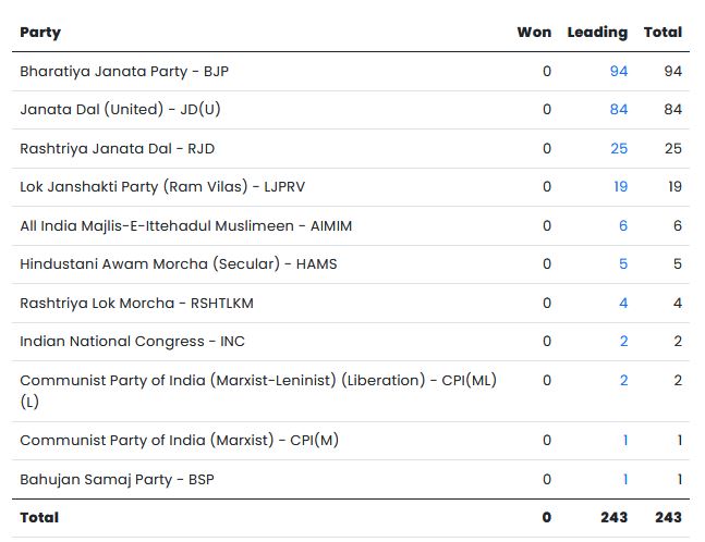 बिहार विधानसभा 2025 – एनडीए को भारी बढ़त, भाजपा सबसे बड़ी पार्टी, कांग्रेस सिर्फ 2 सीटों पर आगे