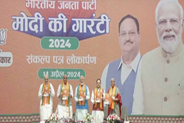 नई दिल्ली। लोकसभा चुनाव-2024 के लिए भाजपा ने अपना चुनाव घोषणा पत्र (संकल्प पत्र – लोकसभा 2024 ) रविवार को जारी कर दिया। प्रधानमंत्री नरेंद्र मोदी, भाजपा के राष्ट्रीय अध्यक्ष जेपी नड्डा, चुनाव घोषणा पत्र समिति के अध्यक्ष एवं रक्षा मंत्री राजनाथ सिंह, केंद्रीय गृह एवं सहकारिता मंत्री अमित शाह और चुनाव घोषणा पत्र समिति की संयोजक और केंद्रीय वित्त मंत्री निर्मला सीतारमण एवं अन्य नेताओं की मौजूदगी में नई दिल्ली स्थित पार्टी के केंद्रीय कार्यालय विस्तार में पार्टी का चुनाव घोषणा पत्र जारी किया गया।