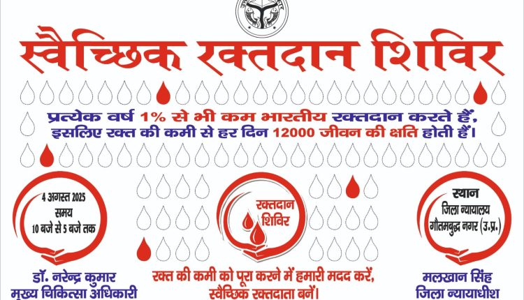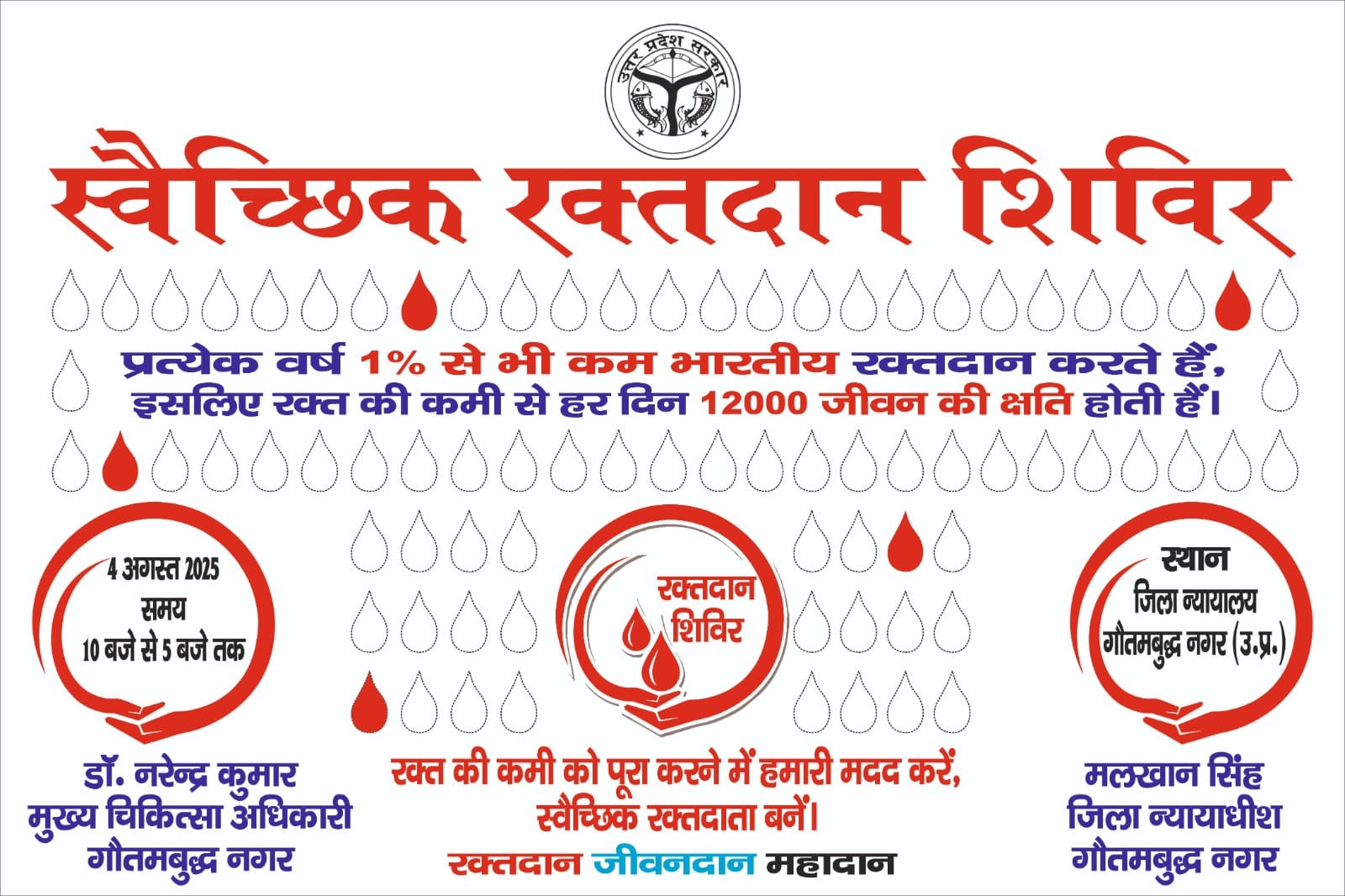 गौतम बुद्ध नगर: रक्त की एक बूंद कई ज़िंदगियों को बचा सकती है, इसी उद्देश्य के साथ जिला न्यायालय परिसर, गौतम बुद्ध नगर में 04 अगस्त 2025 को प्रातः 10:00 से सायं 5:00 तक एक दिवसीय रक्तदान शिविर का आयोजन किया जा रहा है। यह शिविर जिला न्यायाधीश गौतम बुद्ध नगर मलखान सिंह के निर्देशन व मुख्य चिकित्सा अधिकारी डॉ. नरेंद्र कुमार के नेतृत्व में आयोजित किया जा रहा है।