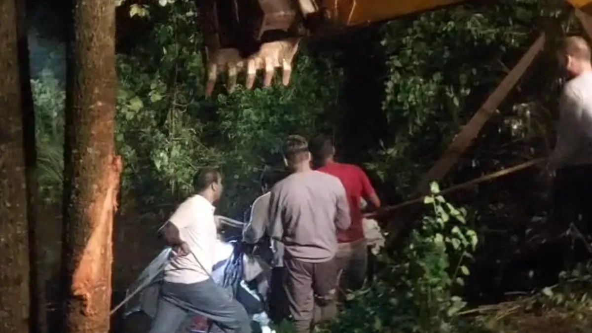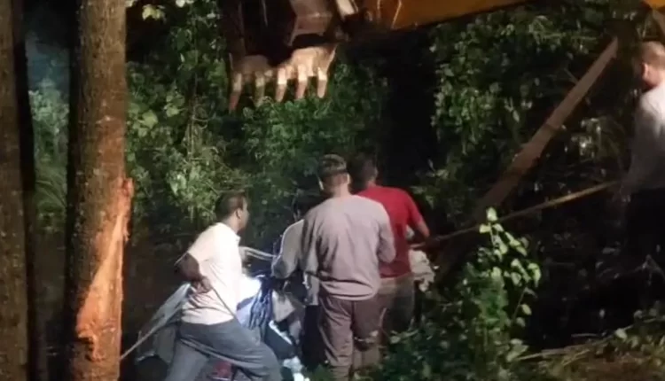 क्रेन की मदद से निकाला गया कार का मलबा