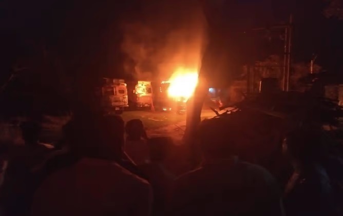 ग्रामीणों ने ट्रक में लगाई आग, पुलिस की ग्रामीणों से हुई नोकझोंक