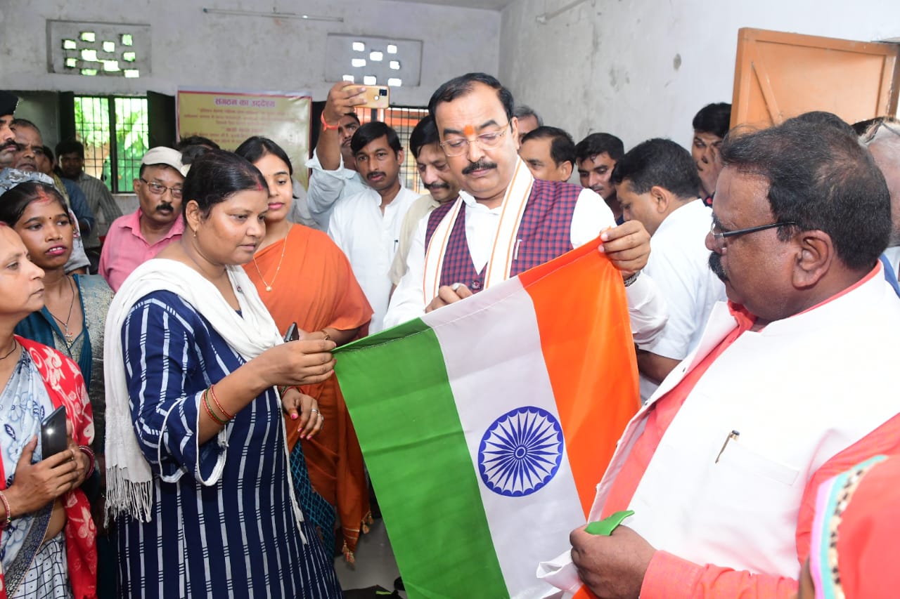 लखनऊः उप मुख्यमंत्री केशव प्रसाद मौर्य ने आज लखनऊ के चिनहट ब्लाक के ग्राम लौलाई में स्वयं सहायता समूहो द्वारा तिरंगा झण्डा बनाने के कार्य का अवलोकन किया।हर घर तिरंगा कार्यक्रम की तैयारियों का जायजा लेने के लिए ग्राम लौलाई पहुंचे डिप्टी सीएम ने इण्डियन प्रेरणा महिला ग्राम संगठन के कार्यों का निरीक्षण किया और समूहो की महिलाओं से की वार्ता, तिरंगे झण्डे के महत्व और महत्ता को समझाया। उप मुख्यमंत्री श्री केशव प्रसाद मौर्य ने ग्राम लौलाई मे 100 तिरंगे झण्डे भी खरीदे। कहा कि स्वयं सहायता समूहों की महिलाओं द्वारा राष्ट्रीय ध्वज बनाने का कार्य सराहनीय है। क्यों मनाया जा रहा है हर घर तिरंगा कार्यक्रम के सवाल पर एक बारगी कई महिलाएं बोल पड़ीं, बोली तिरंगा हमारी आन-बान-शान का प्रतीक है, राष्ट्रीय ध्वज है,हम इसे हरगिज नहीं झुकने देंगे।