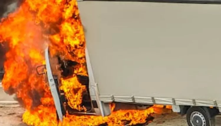 ‘टक्कर के बाद जिप्सम लदे ट्रक में आग लग गई’