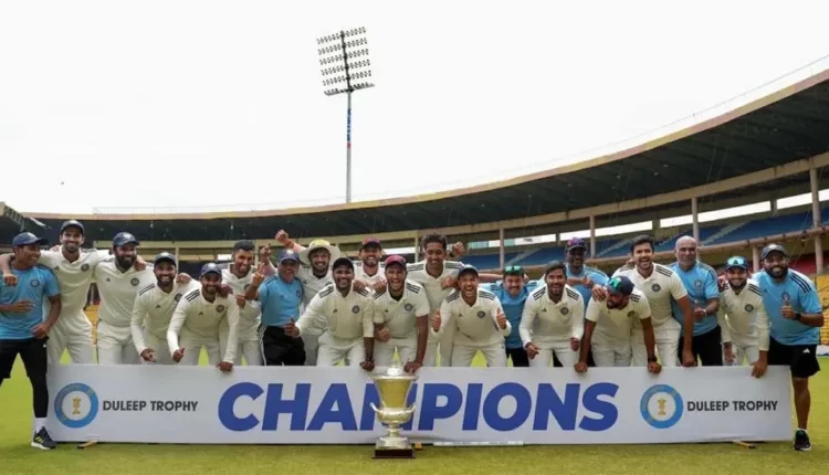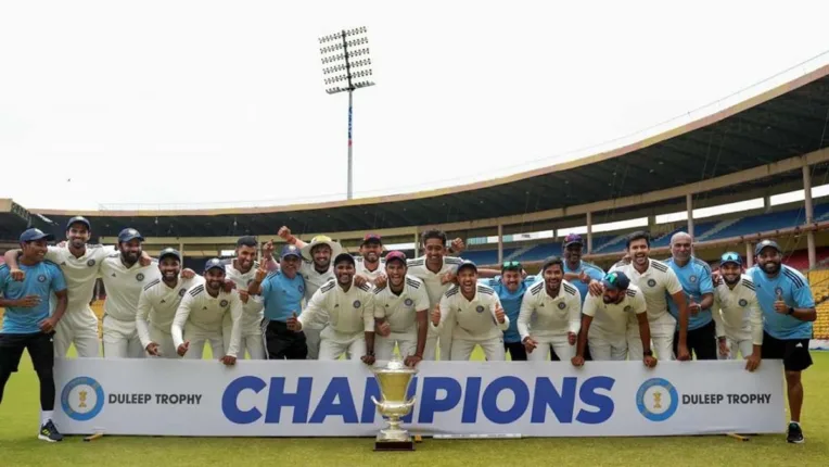 बेंगलुरु. दक्षिण क्षेत्र (South Zone) ने अपना दबदबा कायम रखते हुए रविवार को यहां पश्चिम क्षेत्र (West Zone) को 75 रन से करारी शिकस्त देकर दलीप ट्रॉफी (Duleep Trophy) क्रिकेट टूर्नामेंट का खिताब जीता। पश्चिम क्षेत्र ने 298 रन के लक्ष्य का पीछा करते हुए पांचवें दिन सुबह अपनी दूसरी पारी पांच विकेट पर 182 रन से आगे बढ़ाई और उसकी टीम 222 रन बनाकर आउट हो गई।
