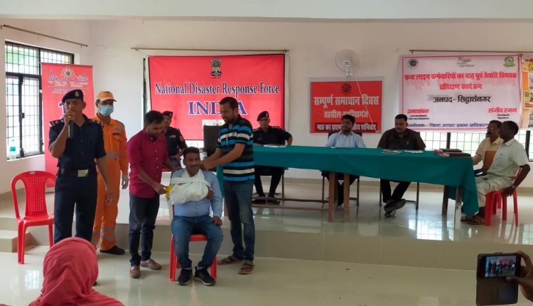 जिला आपदा प्रबंधन प्राधिकरण सिद्धार्थनगर के जिलाधिकारी श्री संजीव रंजन (आई ए एस )के निर्देश में क्रम में आज दिनांक 25.07.2022 को देश की आजादी के 75 वे साल पर आजादी के अमृत महोत्सव मानने के दौरान लोगो को तिरंगा घर लाने और फहराने के लिए प्रोत्साहित करने के लिए”हर घर तिरंगा”अभियान शुरू किया इस मुहिम के तहत एन डी आर एफ ने तहसील डुमरियागंज में “फ्रंट लाइन वर्कर का बाढ़ से पूर्व की तैयारी व प्रतिक्रिया विषयक प्रशिक्षण कार्यक्रम”तहसीलदार श्री अरूण कुमार वर्मा, डुमरियागंज की अध्यक्षता में आयोजित किया गया। प्रशिक्षण में एन. डी. आर.एफ. टीम द्वारा रोड एक्सीडेंट,सर्पदंश, गंभीर चोट,भूकंप व बाढ़ एव (दामिनी ऐप) बज्रपात से बचाव व निपटने के तरीको के संबंध में प्रशिक्षण दिया गया|