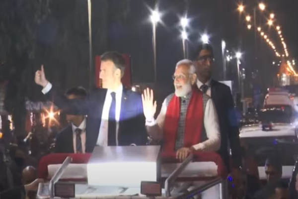 जयपुर: प्रधानमंत्री नरेन्द्र मोदी और फ्रांस के राष्ट्रपति इमैनुएल मैक्रों ने गुरुवार शाम को राजस्थान की राजधानी जयपुर शहर के परकोटे में रोड शो किया। मोदी एवं मैक्रों ने ऐतिहासिक जंतर मंतर के सामने से खुली जीप में सवार होकर जयपुर शहर के त्रिपोलिया बाजार गेट से निकलकर रोड़ शो शुरु किया और बड़ी चौपड़ पर हवामहल के सामने चाय पी और हवामहल को निहारा। इस दौरान मैक्रो ने कुछ खरीददारी भी की।