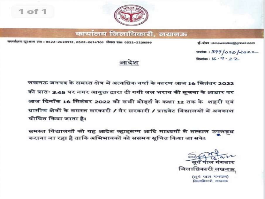 बता दें कि भारतीय मौसम विभाग ने कल ही भारी से भारी बारिश की चेतावनी जारी की थी। आईएमडी की सैटेलाइट इमेज में लखनऊ के ऊपर घने बादलों का जमावड़ा दिखा था। सुबह-सुबहजारी डीएम सूर्यपाल गंगवार द्वारा जारी आदेश में बताया गया है कि भोर में 3:45 बजे नगर आयुक्त से मिली सूचना के आधार पर 16 सितम्बर को सभी बोर्ड्स के बारहवीं तक के शहरी और ग्रामीण क्षेत्रों के सभी सरकारी, गैर सरकारी और प्राइवेट स्कूलों के लिए अवकाश घोषित किया गया है। उन्होंने विद्यालयों को वाट्सएप आदि के जरिए अभिभावकों को तत्काल यह जानकारी उपलब्ध कराने का भी निर्देश दिया।