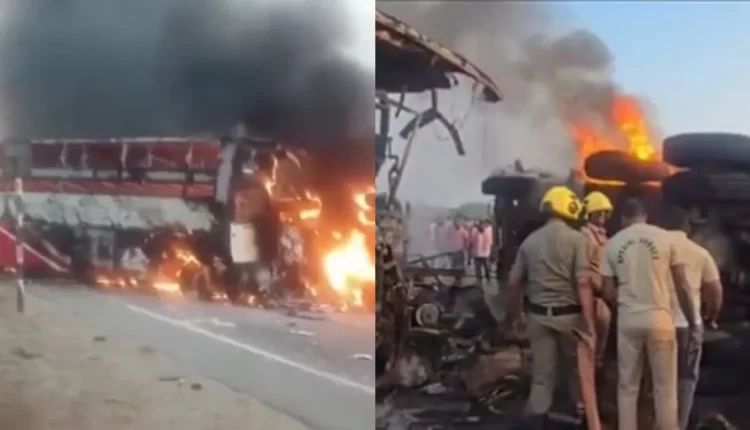 आंध्र प्रदेश के मारकापुरम जिले में गुरुवार को एक दर्दनाक सड़क हादसे ने पूरे इलाके को झकझोर दिया। रायवरम के पास यात्रियों से भरी एक बस और बजरी से लदे टिपर ट्रक के बीच जोरदार टक्कर हो गई। टक्कर इतनी भीषण थी कि कुछ ही पलों में दोनों वाहन आग की चपेट में आ गए, जिससे बस में सवार लोगों को बाहर निकलने का मौका तक नहीं मिल सका।