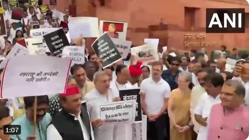 नई दिल्ली। 23 जुलाई को वित् मंत्री निर्मला सीतारमण द्वारा पेश किए गए केंद्रीय बजट को INDIA गठबंधन ने कुर्सी बचाओ बजट और भेदभावपूर्ण बजट बताया है। केंद्रीय बजट को लेकर INDIA गठबंधन के नेताओं ने आज संसद परिसर में विरोध प्रदर्शन किया। कांग्रेस अध्यक्ष और एलओपी राज्यसभा मल्लिकार्जुन खड़गेने कहा केंद्रीय बजट में कई लोगों को न्याय नहीं मिला। हम न्याय के लिए लड़ रहे हैं।