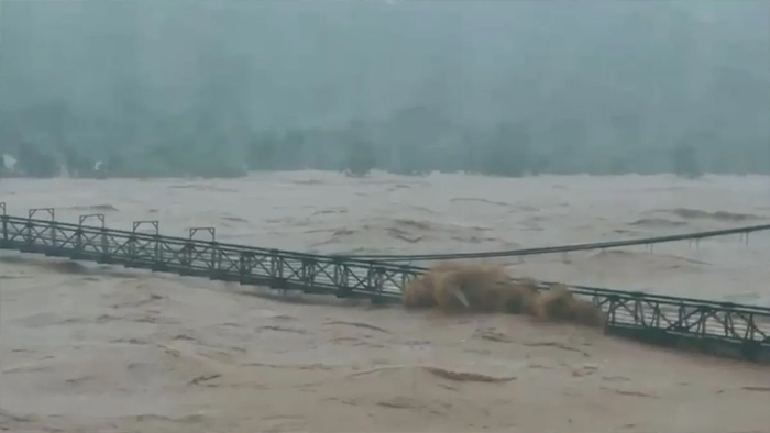 नगरोटा। जम्मू-कश्मीर (Jammu and Kashmir) के नगरोटा (Nagrota) में भारी बारिश (Heavy Rains) से जनजीवन पर भारी असर पड़ा है। तवी नदी (Tawi River) उफान पर है और उसके आस-पास के इलाके में बाढ़ (Flood) जैसे हालात हैं। भारी बारिश के सैलाब में नगरोटा में तवी नदी पर बना ब्रिज (Bridge) पलक झपकते ही नदी में समा गया। नदी में ब्रिज के गिरने का वीडियो सामने आया है। जिसमें देखा जा सकता है कि नदी उफान पर है और बारिश लगातार जारी है। नदी में पानी की लहरें ब्रिज तक पहुंच जाती हैं और देखते ही देखते ब्रिज नदी में समा जाता है।
