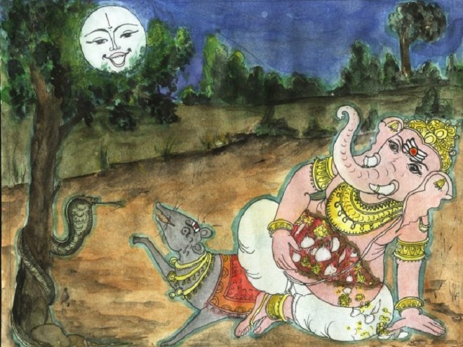 श्रीकृष्ण चंद्रमा के दर्शन कि बात विस्तार पूछने पर नारदजी ने श्रीकृष्ण को कलंक वाली यह कथा बताई थी। एक बार भगवान श्रीगणेश ब्रह्मलोक से होते हुए लौट रहे थे कि चंद्रमा को गणेशजी का स्थूल शरीर और गजमुख देखकर हंसी आ गई। गणेश जी को यह अपमान सहन नहीं हुआ। उन्होंने चंद्रमा को शाप देते हुए कहा, ‘पापी तूने मेरा मजाक उड़ाया हैं। आज मैं तुझे शाप देता हूं कि जो भी तेरा मुख देखेगा, वह कलंकित हो जायेगा।
