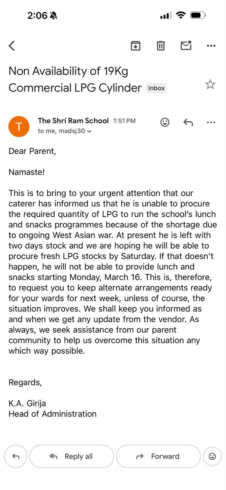 ईमेल में स्पष्ट लिखा गया है, “एलपीजी सिलेंडर की कमी हो गई है। कैटरर के पास सिर्फ दो दिन का गैस स्टॉक बचा है। शनिवार तक नया एलपीजी न मिला तो सोमवार से बच्चों का लंच और स्नैक्स बंद हो सकता है। कृपया वैकल्पिक व्यवस्था रखें।” यह चेतावनी स्कूल प्रशासन की तरफ से सीधे अभिभावकों को दी गई है, ताकि वे समय रहते बच्चों के लिए टिफिन या अन्य विकल्प तैयार कर सकें।
