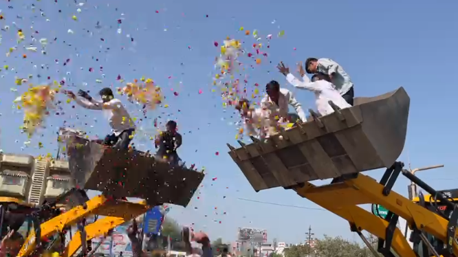Maharashtra Bulldozer : जेसीबी यानी बुलडोज़र उत्तर प्रदेश चुनाव से ट्रेन्डिंग में है, ऐसा ही नजारा देखने मिला है ,महाराष्ट्र में जहां बीड जिले में शिवसेना पार्टी के जिला प्रमुख का स्वागत अनोखे तरीके से किया गया, बता दें कि पिछले 4 महीनो से शिवसेना जिला प्रमुख का पद रिक्त था आखिरकार 4 महीने बाद शिवसेना के कार्यकर्ता अनिल जगताप को इस रिक्त पद की कमान सौंपी गयी, मंगलवार दोपहर जैसे ही अनिल जगताप को पद सौपा गया उसी क्षण स्थानीय लोगो ने अनिल जगताप को तरह तरह तरीके से मुबारक बाद देना शुरू कर दिए, कुछ ने फूल मालाएं पहनाई, तो किसी ने रैली निकाला,किसी ने पटाख़े फोड़ कर स्वागत किया, लेकिन एक गुट ने तो हद ही कर दिया जेसीबी से फुल बरसा कर ज़ोरदार स्वागत करके अनोखे तरह से स्वागत करने के कारण चर्चा में बने हुए है।