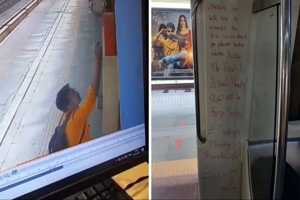 आरोपी से पूछताछ की जा रही है। बता दें कि 19 मई को पटेल नगर और राजीव चौक मेट्रो स्टेशन पर सीएम केजरीवाल के लिए धमकी भरा मैसेज लिखा गया था। पुलिस ने मैसेज लिखते हुए आरोपी का सीसीटीवी फुटेज भी बरामद कर लिया है। ऐसा माना जा रहा है कि आरोपी ने फेमस होने के लिए ऐसी हरकत कर अपने सोशल मीडिया अकाउंट पर पोस्ट कीं। सूत्रों के मुताबिक, आरोपी अंकित गोयल बरेली का रहने वाला है और वह किसी भी राजनीतिक दल से जुड़ा नहीं है। आरोपी ने मेट्रो ट्रेन के अंदर लिखा था, “केजरीवाल दिल्ली छोड़ दीजिए। कृपया। अन्यथा, आपको तीन थप्पड़ याद रखने होंगे, जो आपने चुनाव से पहले खाए थे। अब असली थप्पड़ मिलेगा।”