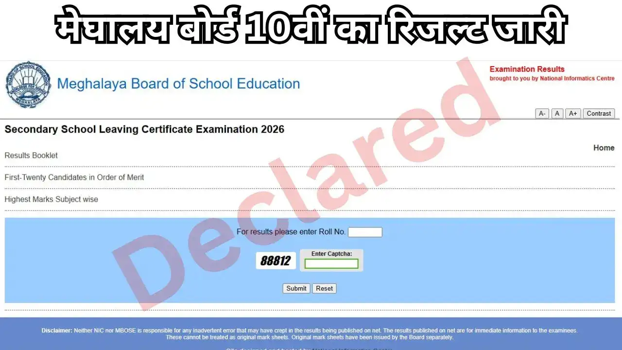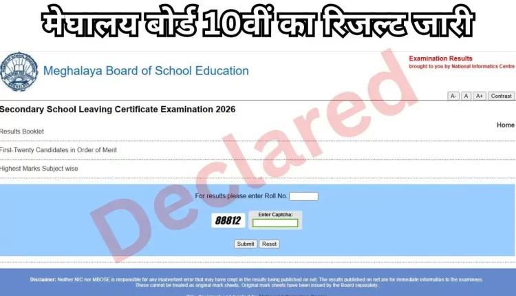 मेघालय बोर्ड ऑफ स्कूल एजुकेशन ने आज सुबह 11 बजे MBOSE SSLC Result 2026 घोषित कर दिया। कक्षा 10 की परीक्षा में शामिल छात्र अब mboseresults.in और megresults.nic.in वेबसाइट पर अपने रिजल्ट को चेक और डाउनलोड कर सकते हैं। इस लेख में हम आपको डायरेक्ट लिंक और स्टेप बाय स्टेप तरीका भी बता रहे हैं, जिससे आप आसानी से अपना रिजल्ट देख सकते हैं।