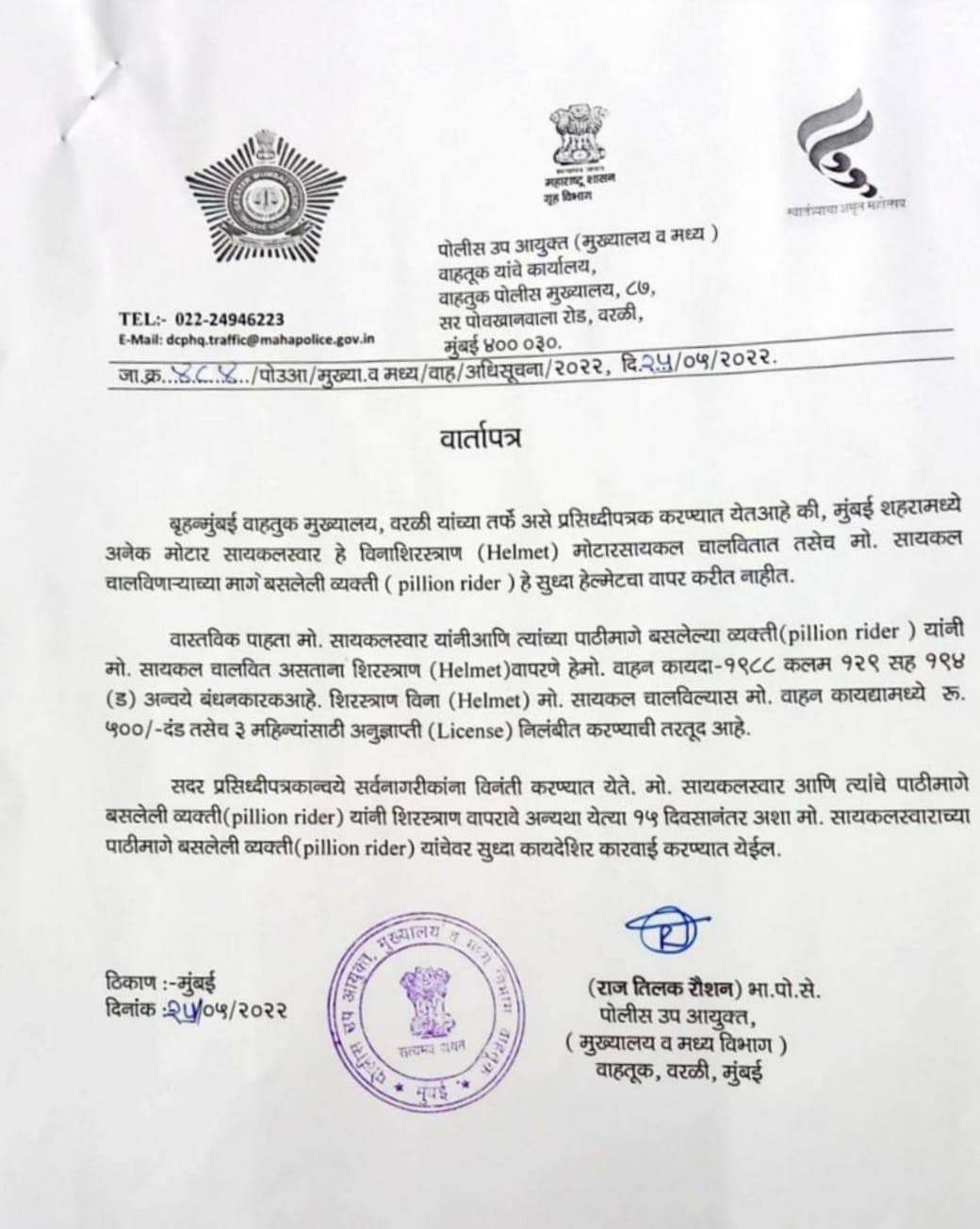 मीडिया रिपोर्ट्स के मुताबिक, मुंबई की ट्रैफिक पुलिस ने यूट्यूब में एक वीडियो अपलोड किया है। इस वीडियो के जरिए ट्रैफिक पुलिस ने कहा है कि बिना हेलमेट पहने बाइक चलाने वालों के खिलाफ चालान सीधे RTO में भेजा जाएगा। बाइक चलाने वाले का लाइसेंस 3 महीने के लिए सस्पेंड किया जाएगा। इसके साथ ही ट्रैफिक नियम तोड़ने वाले को पुलिस स्टेशन भेजा जाएगा। जहां उसे 2 घंटे का वीडियो देखना होगा। फिलहाल ये नियम मुंबई में ही लागू होंगे। पिछले महीने मुंबई पुलिस ने बिना हेलमेट पहने बाइक