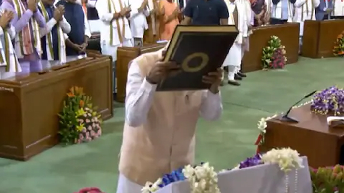 नई दिल्ली: आज नरेंद्र मोदी पुराने संसद भवन में पहुंचे और सबसे पहले वहां रखी संविधान की प्रति को माथे पर लगाया. जबकि इससे पहले राहुल गांधी लोकसभा चुनाव में पूरे देश में घूम-घूमकर संविधान की कॉपी दिखाकर कहते रहे कि बीजेपी सत्ता में आई तो उसे बदल देगी. जबकि पीएम नरेंद्र मोदी के इस काम से साबित हो गया कि उनके लिए संविधान का महत्व सबसे ऊपर है. पहले भी कई मौकों पर पीएम नरेंद्र मोदी संविधान के बारे में बाबा साहेब डॉ. भीमराव अंबेडकर के योगदान की सराहना कर चुके हैं. संसद भवन में आज एनडीए की बैठक में पीएम नरेंद्र मोदी को एक बार फिर से प्रधानमंत्री पद के लिए चुना गया.
