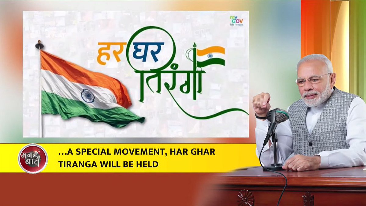 प्रधानमंत्री ने ट्विटर पर अपने मन की बात के पिछले संस्करण को भी साझा किया है। इसमें उन्होंने आज़ादी के अमृत महोत्सव के तहत, 13 से 15 अगस्त तक ‘हर घर तिरंगा’ अभियान के आयोजन का जिक्र किया था। इसमें उन्होंने देशवासियों से अभियान का हिस्सा बनकर अपने घर पर तिरंगा फहराने की अपील की थी। इसके साथ ही उन्होंने 2 अगस्त से 15 अगस्त तक देशवासियों को अपनी सोशल मीडिया प्रोफाइल तस्वीरों में तिरंगा लगाने का भी सुझाव दिया था। उल्लेखनीय है कि 2 अगस्त का हमारे तिरंगे से एक विशेष संबंध है। इसी दिन पिंगली वेंकैया की जयंती होती है जिन्होंने हमारे राष्ट्रीय ध्वज को डिजाइन किया था।