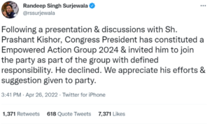 मंगलवार सुबह AICC प्रवक्ता रणदीप सुरजेवाला ने ट्वीट के जरिए प्रशांत को प्रस्ताव दिए जाने और उनके इसे ठुकरा देने की जानकारी दी। इसके बाद से ही कयासबाजी के दौर शुरु हो गया है ।