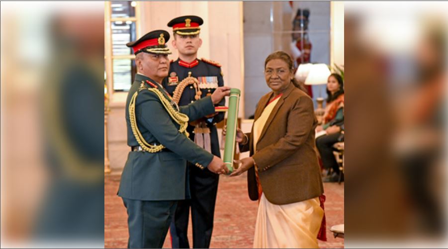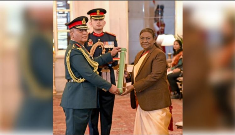नई दिल्ली : राष्ट्रपति द्रौपदी मुर्मू ने गुरुवार को नेपाल के सेनाध्यक्ष जनरल अशोक राज सिगडेल को भारतीय सेना के जनरल की मानद रैंक से सम्मानित किया। राष्ट्रपति द्रौपदी मुर्मू ने राष्ट्रपति भवन में आयोजित एक विशेष अलंकरण समारोह में नेपाली सेना के सेनाध्यक्ष जनरल अशोक राज सिगडेल को उनकी सराहनीय सैन्य शक्ति, भारत के साथ नेपाल के दीर्घकालिक तथा मैत्रीपूर्ण संबंधों को और बढ़ावा देने में उनके अतुलनीय योगदान के लिए भारतीय सेना के जनरल की मानद रैंक प्रदान की।