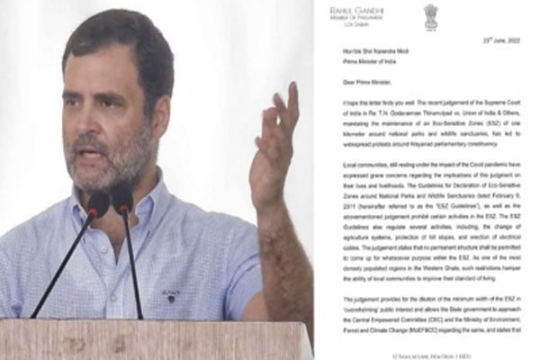 नई दिल्ली । कांग्रेस नेता और वायनाड के सांसद राहुल गांधी ने केरल के वायनाड के स्थानीय समुदायों की दुर्दशा की ओर ध्यान आकर्षित करते हुए प्रधान मंत्री नरेंद्र मोदी को एक पत्र लिखा है, जिनकी आजीविका राष्ट्रीय उद्यानों के आसपास पर्यावरण-संवेदनशील क्षेत्रों के रखरखाव पर सुप्रीम कोर्ट के हालिया फैसले से प्रभावित है। और वन्यजीव अभयारण्य। आदेश का प्रतिकूल प्रभाव पड़ेगा। राहुल गांधी ने फेसबुक पर लिखा, “राज्य और केंद्र सरकारें केंद्रीय अधिकार प्राप्त समिति (सीईसी) और पर्यावरण, वन और जलवायु परिवर्तन मंत्रालय (एमओईएफ और सीसी) से ईएसजेड की न्यूनतम चौड़ाई कम करने का अनुरोध करके मदद कर सकती हैं।”