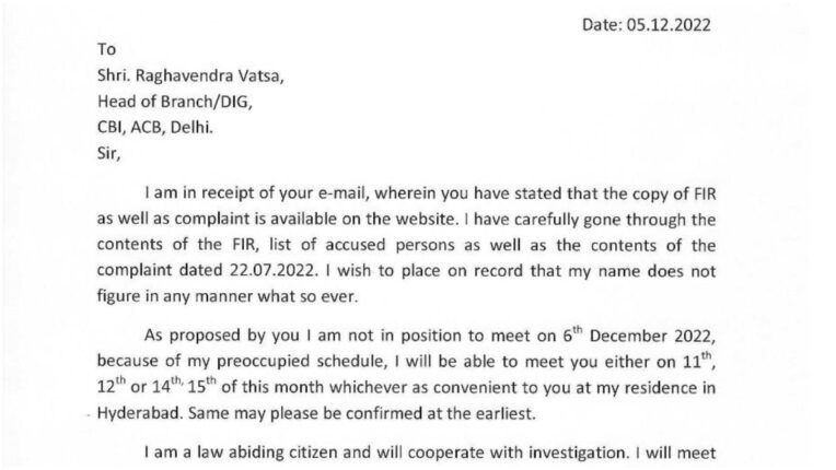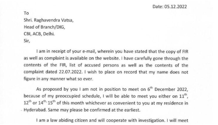 इससे पहले सीबीआई ने शुक्रवार को कविता को नोटिस जारी कर छह दिसंबर को पूछताछ के लिए बुलाया था। केंद्रीय जांच ब्यूरो (सीबीआई) के अधिकारी को लिखे पत्र में उन्होंने कहा कि दस्तावेजों की प्राप्ति के बाद एजेंसी के साथ उनकी मुलाकात की तारीख हैदराबाद में तय की जा सकती है। आखिरकार उन्होंने पत्र में मिलने का समय बता दिया है।
