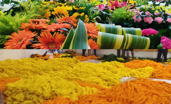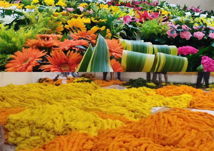 रंगोली के लिए अलग से 6 कुंतल फूल सफेद,नीले,पीले, बैंगनी व हरी पत्ती के फूल खासतौर पर सजावट के लिए इस्तेमाल किये गए हैं। राममंदिर की सजावट के लिए 40 कुंतल गेंदा, जरबेरा फूलों के 2 हजार बंडल इस्तेमाल हुए हैं। इसके अलावा आर्किड, लिली, डेनिम, कार्नेसन जैसे फूलों की प्रजातियां कोलकाता, बैंगलोर से मंगवाई गई हैं। बालकृष्ण सैनी ने बताया कि इस आयोजन से पहले भी उन्होंने श्रीराम लला के प्राण प्रतिष्ठा के समय भी फूलों से सजावट का काम किया था।