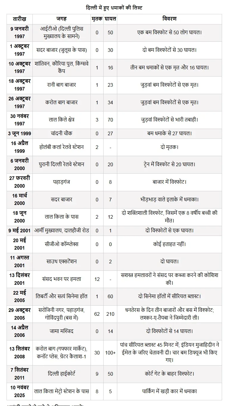 यह पहला मौका नहीं है, जब दिल्ली इस तरह के जानलेवा धमाकों का गवाह बनी है। भारत की राजधानी होने के कारण दिल्ली कई बार आतंकी हमलों और बम धमाकों का शिकार बनी है। इन घटनाओं ने न केवल शहर को दहलाया, बल्कि पूरे देश की सुरक्षा व्यवस्था पर भी सवाल खड़े किए।
