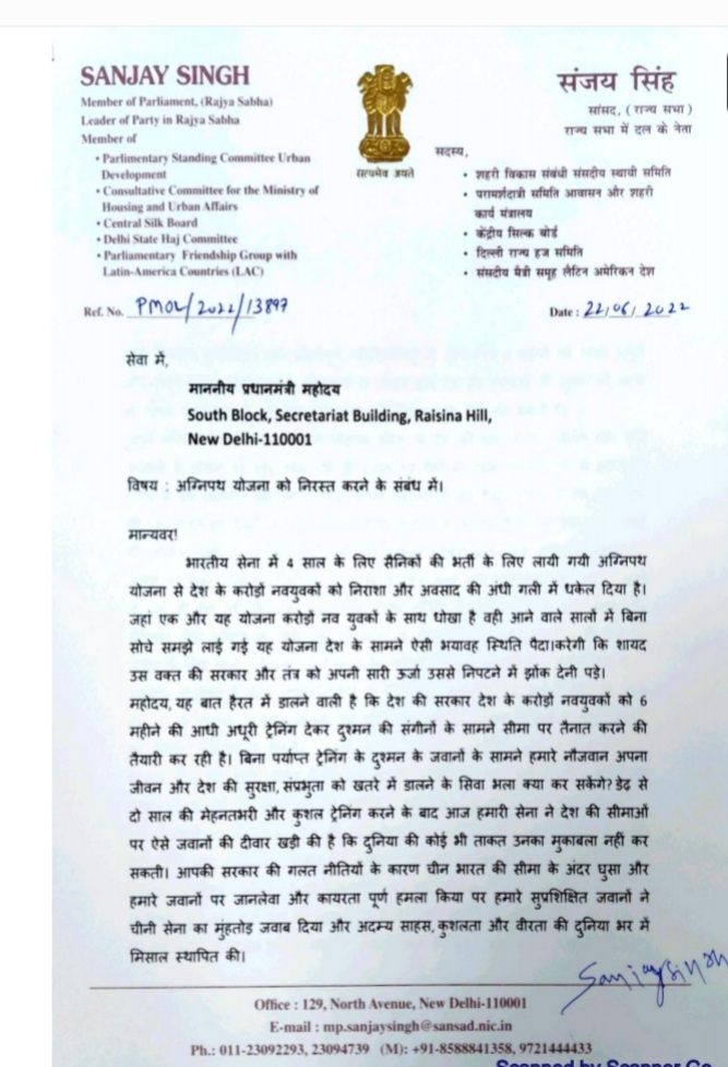 Sanjay Singh : “आप” के राज्यसभा सदस्य संजय सिंह ने नरेन्द्र मोदी को अग्निपथ को लेकर लिखा पत्र
