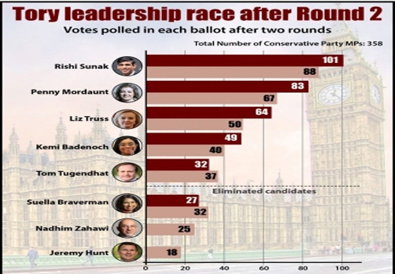सनक ने 101 मतों के साथ व्यापार मंत्री पेनी मोडरंट पर अपनी बढ़त बनाए रखी, जिन्हें 83 मत मिले। बुधवार को पहले दौर में उन्हें 88 वोट मिले थे, जबकि मोडरंट 67 वोटों के साथ दूसरे स्थान पर रहे थे। गुरुवार की वोटिंग में, विदेश मंत्री लिज ट्रस अभी भी 64 वोटों के साथ तीसरे स्थान पर बने हुए हैं। इसके अलावा केमी बडेनोच को 49 वोट मिले और बैकबेंच सांसद टॉम तुगेंदत को 32 वोट मिले हैं।