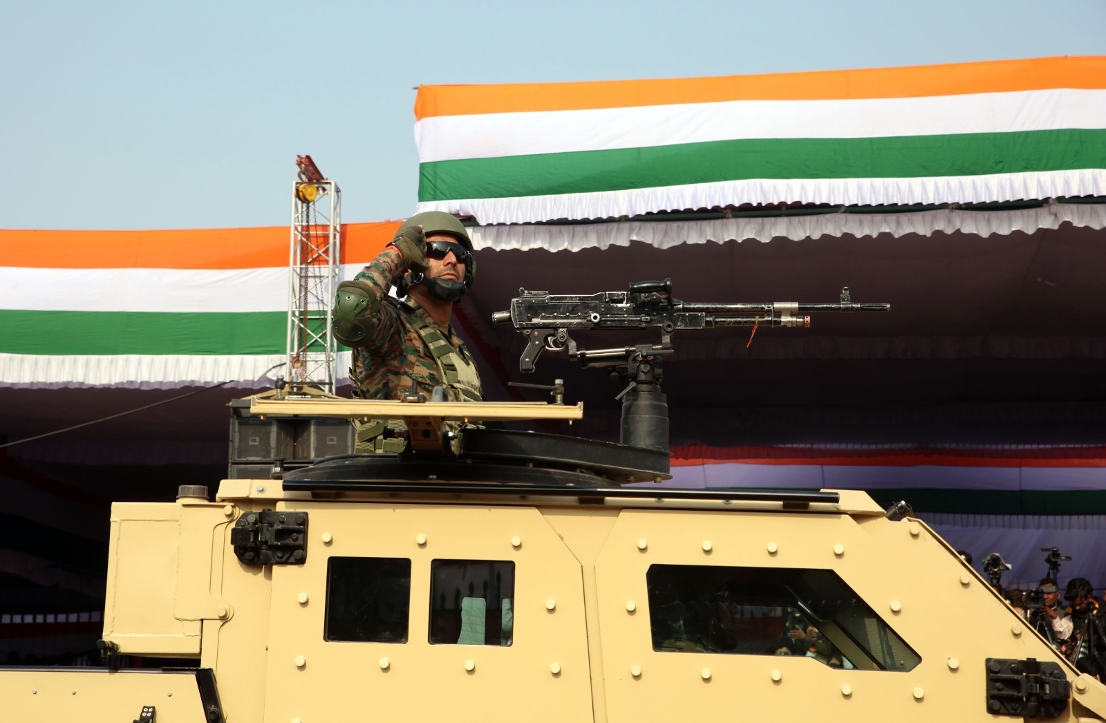 लखनऊ। एक तरफ इन्फेंट्री व्हीकल बीएमपी -2 सारथ की गड़गड़ाहट रणभूमि में होने की अनुभूति करा रही थी तो दूसरी ओर सेना और सशस्त्र बलों की मार्चिंग टुकड़ी जब विधानभवन के सामने से गुजरी तो उनके बूटों की धमक से मानो आसमान हिल गया हो।