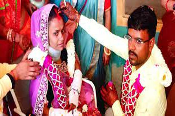 कोटा के रावतभाटा में शादी से चार दिन पहले घर में ही दुल्हन को चक्कर आ गए, जिससे वह सीढ़ियों में गिर गई और दोनों हाथों में फैक्चर हो गया। दुल्हन की तबियत खराब होने पर उसे कोटा एमबीएस अस्पताल में भर्ती कराया गया। रविवार को शादी को शादी का मुहुर्त था। इसको देखते हुए दूल्हे ने अस्पताल पहुंचकर दुल्हन को वरमाला पहनाई और मांग में सिंदूर भर दिया। इस दौरान अस्पताल में जो भी लोग मौजूद थे सभी अचंभित रह गए।