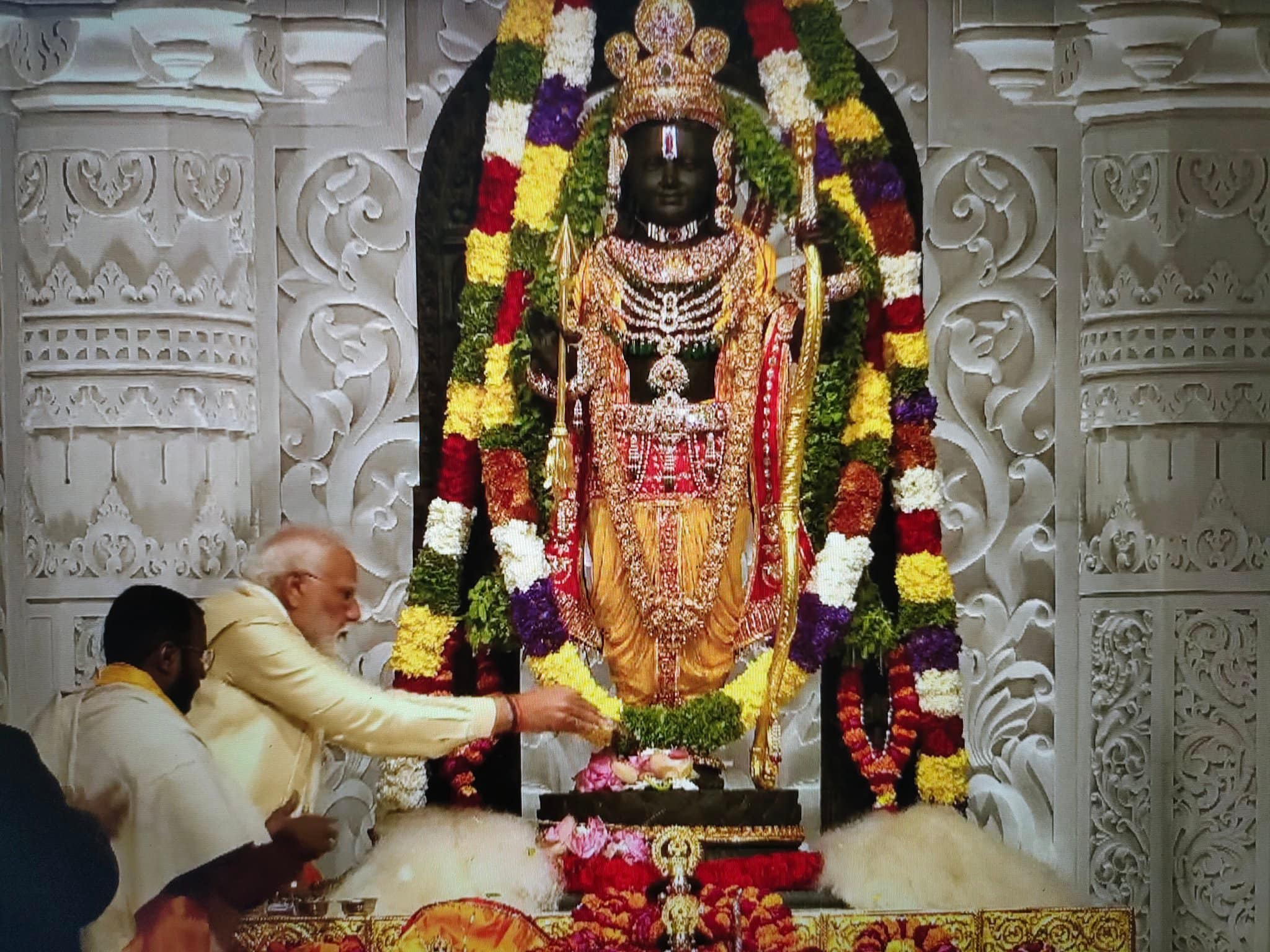 अनुष्ठान में राष्ट्रीय स्वयं सेवक संघ (RSS) प्रमुख मोहन भागवत भी शामिल हुए। इस मौके पर उत्तर प्रदेश की राज्यपाल आनंदीबेन पटेल और मुख्यमंत्री योगी आदित्यनाथ भी मौजूद रहे। एक आधिकारिक प्रवक्ता ने बताया कि मध्यान्ह में साढ़े बारह बजे (12-29) बजे रामलला के नवीन विग्रह की प्राण प्रतिष्ठा की गयी। पता हो कि प्रधानमंत्री नरेंद्र मोदी ने बीते 11 जनवरी को 1एक ऑडियो मैसेज जारी किया था। जिसमें उन्होंने बताया था कि, वह यम नियम का पालन करेंगे। उन्होंने कहा था, “मेरा सौभाग्य है कि मुझे भी इस पुण्य का साक्षी बनने का अवसर मिल रहा है। ये मेरे लिए कल्पनातीत अनुभूतियों का समय है। मैं भावुक हूं, भाव-विह्वल हूं। मैं जीवन में पहली बार इस तरह के मनोभावों से गुजर रहा हूं।