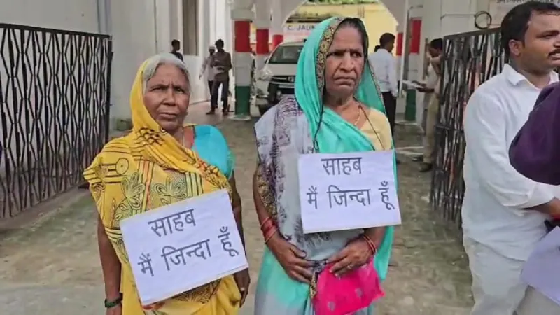 जौनपुर के पचोखर गांव के महगू निषाद (65), मगरू हरिजन (62) और कृपा शंकर तिवारी डीएम कार्यालय पहुंचे तो वहां मौजूद लोग दंग रह गए। गले में “साहब, मैं जिंदा हूं” की तख्ती लगाए इन तीनों ने बताया कि उन्हें फाइलों में मृत दिखाकर उनकी पेंशन पिछले दो साल से रोक दी गई है। पीड़ितों ने आरोप लगाया कि ग्राम प्रधान से पुरानी रंजिश के चलते यह साजिश रची गई है और जानबूझकर उन्हें मृतक घोषित कर दिया गया।