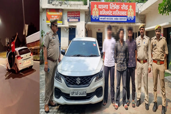 इनका एक साथी फरार है जिसकी तलाश की जा रही है। पुलिस से मिली जानकारी के मुताबिक, साहिबाबाद रेपिड मेट्रो स्टेशन के सामने रोड पर 3-4 युवक खतरनाक तरीके से चलती कार पर स्टंट करते दिखायी दे रहे हैं। वीडियो का तत्काल संज्ञान लेकर पुलिस ने मामला दर्ज किया। इसके बाद बेलेनो कार पर स्टंट कर रहे युवक प्रियांशु सिंह, अर्जुन त्यागी, राहुल आहुजा और सत्यम की पहचान कर 3 आरोपी युवकों को पुलिस ने गिरफ्तार किया है।