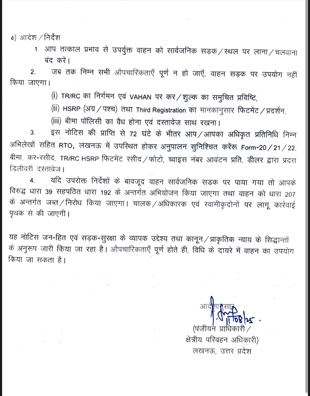 परिवहन विभाग ने सभी वाहन स्वामियों से अपील की है कि वह वाहन की डिलीवरी लेते समय सुनिश्चित करें कि पंजीयन प्रक्रिया पूर्ण हो चुकी है। एचएसआरपी /थर्ड रजिस्ट्रेशन मार्क नियमानुसार लगाए गए हैं। केवल इनवॉइस और बीमा के आधार पर वाहन को सड़क पर न निकालें। किसी भी डीलर द्वारा बिना पंजीयन वाहन सौंपने पर तत्काल निकटतम आरटीओ और एआरटीओ को सूचित करें।