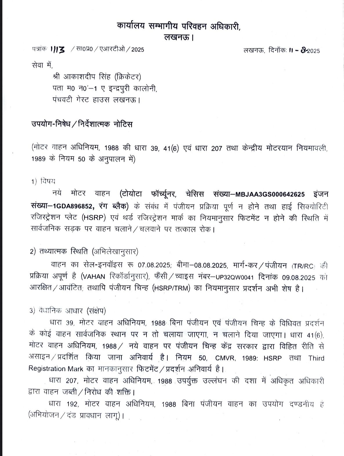 इस मामले में क्रिकेटर आकाशदीप सिंह को मोटर वाहन अधिनियम, 1988 की धारा 39, 41(6) एवं 207 के अंतर्गत वाहन उपयोग निषेध का नोटिस जारी किया गया है। इसमें निर्देश दिया गया है कि जब तक सभी विधिक औपचारिकताएं पंजीयन पूर्ण होना, एचएसआरपी एवं थर्ड रजिस्ट्रेशन मार्क का फिटमेंट, और वैध बीमा पूरी नहीं हो जातीं, वाहन को सड़क पर न चलाया जाए।