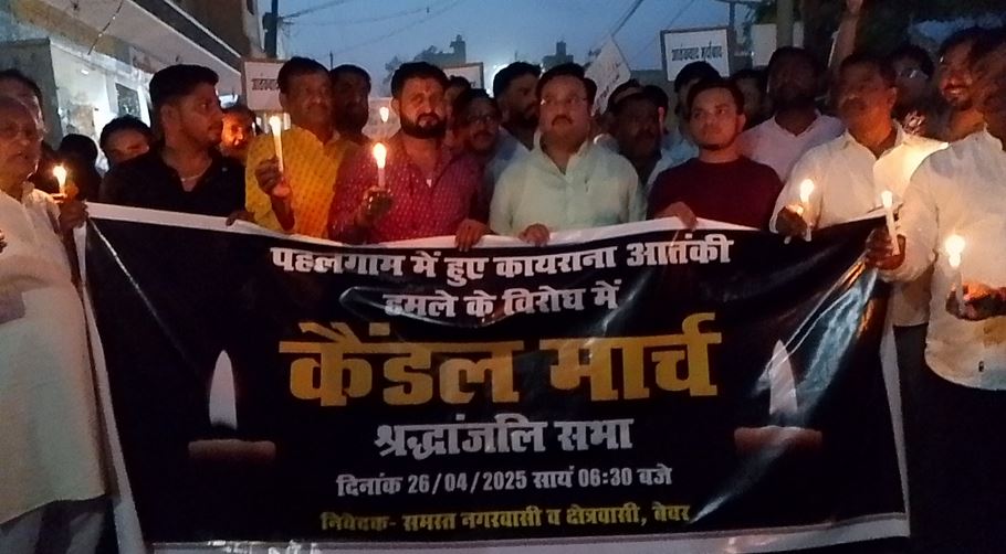 मैनपुरी। पहलगाम में हुए आतंकी हमले के विरोध में रविवार को कस्बा बेवर में नागरिकों ने एकजुट होकर कैंडल मार्च निकाला। इस दौरान लोगों ने हाथों में बैनर, पट्टियां और मोमबत्तियां लेकर आतंकवाद के खिलाफ आक्रोश व्यक्त किया और पाकिस्तान के खिलाफ सख्त कार्रवाई की मांग की।