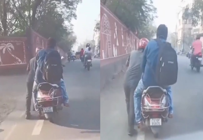 मुंबई: सोशल मीडिया में एक वीडियो खूब वायरल हो रहा है। इस वीडियो में एत व्यक्ति स्कूटी पर बैठा हुआ है जबकि एक व्यक्ति उस स्कूटी को पैदल ही खींचता नजर आ रहा है। मीडिया रिपोर्ट्स के अनुसार यह वायरल वीडियो तेलंगाना का बताया जा रहा है। इस वीडियो को सोशल मीडिया के प्लेटफार्म एक्स पर शेयर किया है।