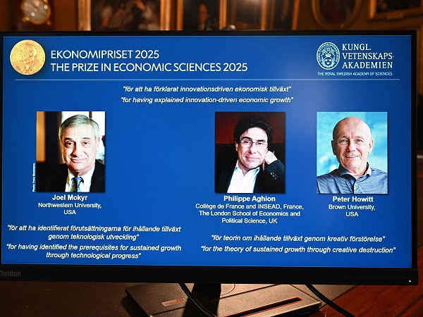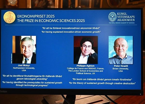 नई दिल्ली : साल 2025 के लिए अर्थशास्त्र के नोबेल पुरस्कार के विजेताओं की घोषणाओं हो गई है। इस साल आर्थिक विकास की नई व्याख्या के लिए जोएल मोकिर, फिलिप एगियन और पीटर हॉविट (Peter Howitt) को इस साल का अर्थशास्त्र का नोबेल पुरस्कार देने का ऐलान किया गया है। मोकिर नॉर्थवेस्टर्न यूनिवर्सिटी से, एगियन कॉलेज डी फ्रांस और लंदन स्कूल ऑफ इकोनॉमिक्स से और हॉविट ब्राउन यूनिवर्सिटी से संबंध रखते हैं।