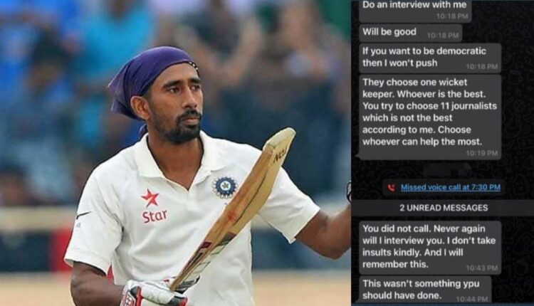 Wriddhiman Saha : भारतीय विकेटकीपर-बल्लेबाज Wriddhiman Saha ने एक पत्रकार के परेशान करने वाले मैसेजेस के साथ क्रिकेटर को इंटरव्यू के लिए मजबूर करने वाले चैट का स्क्रीनशॉट साझा किया है. पत्रकार ने साहा को एक इंटरव्यू करने के लिए “जो भी मदद कर सकता है” उन्हें चुनने का संकेत दिया. – स्क्रीनशॉट को श्रीलंका के खिलाफ आने वाले दो टेस्ट मैचों की श्रृंखला के लिए टीम से बहार किए जाने के तुरंत बाद पोस्ट किया गया था.